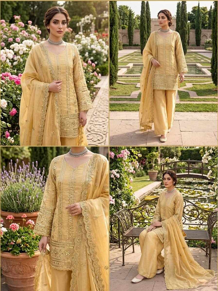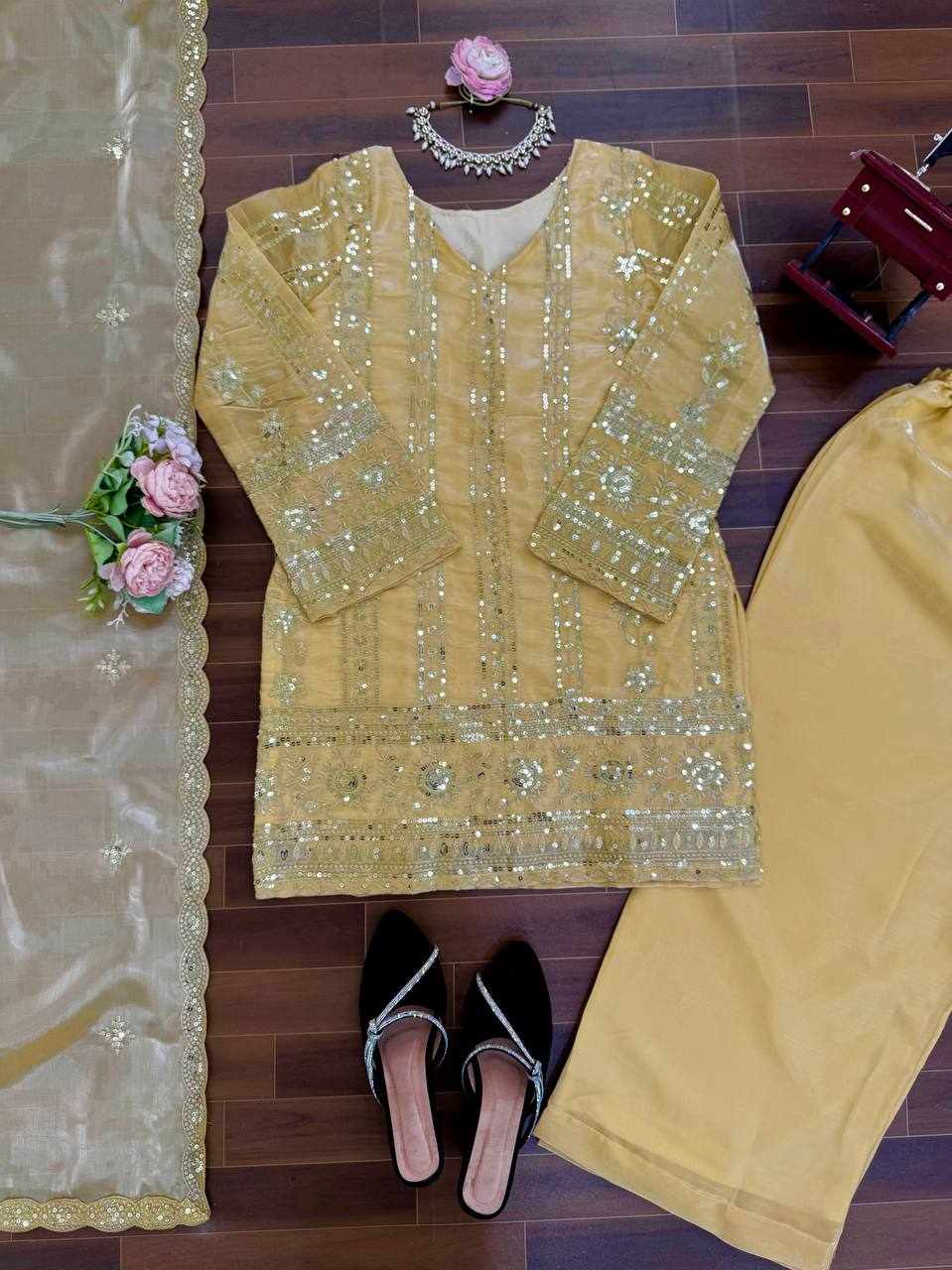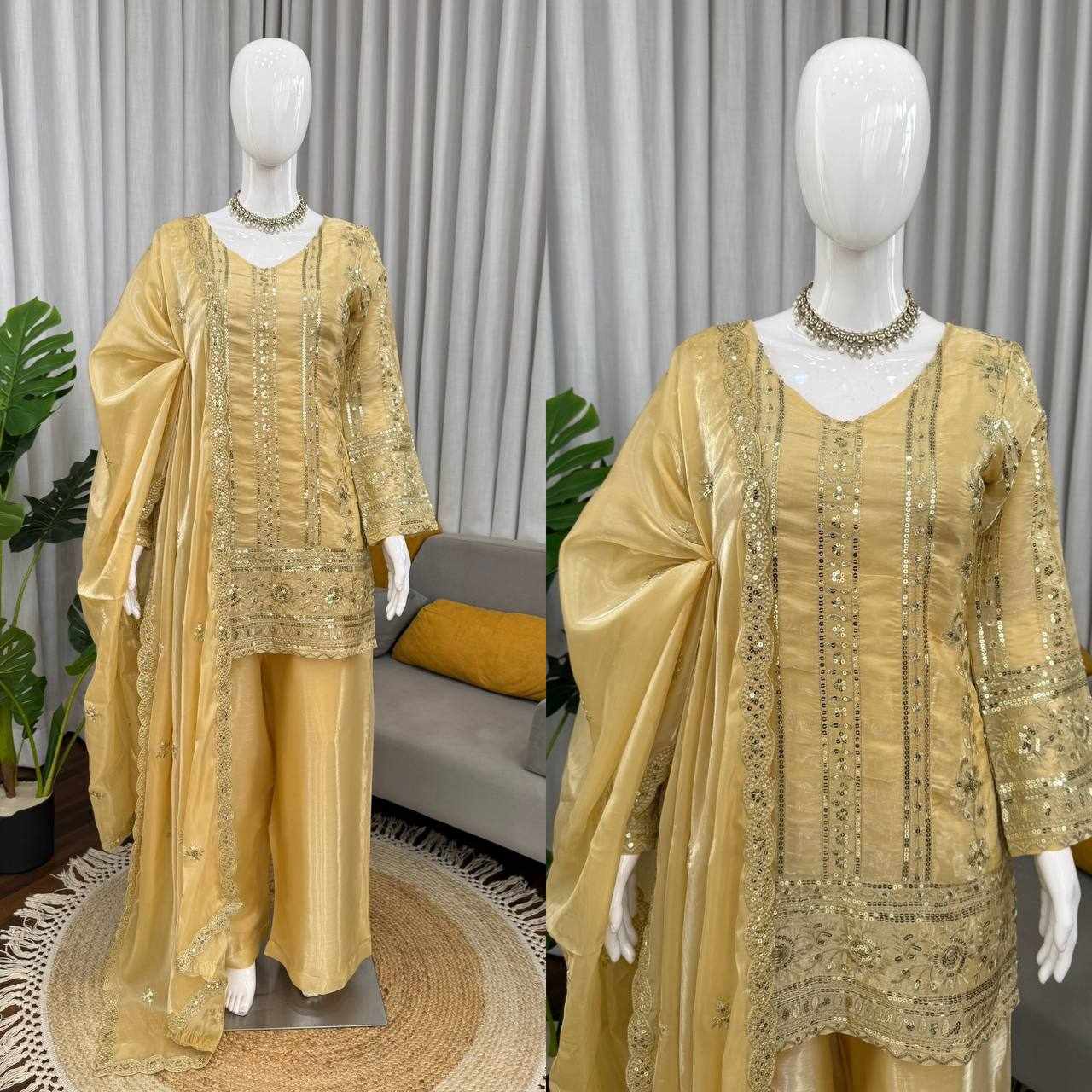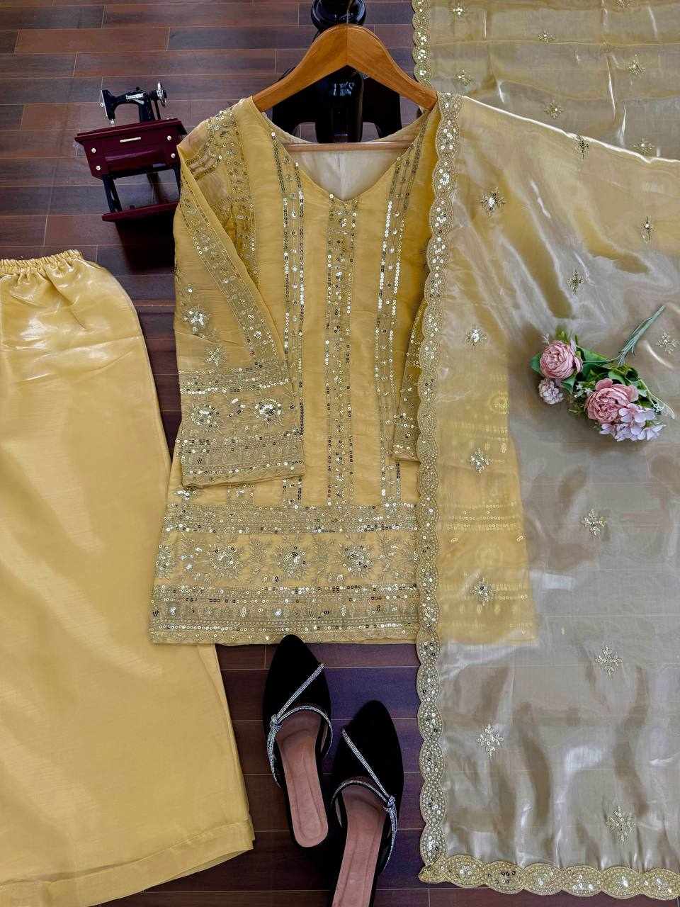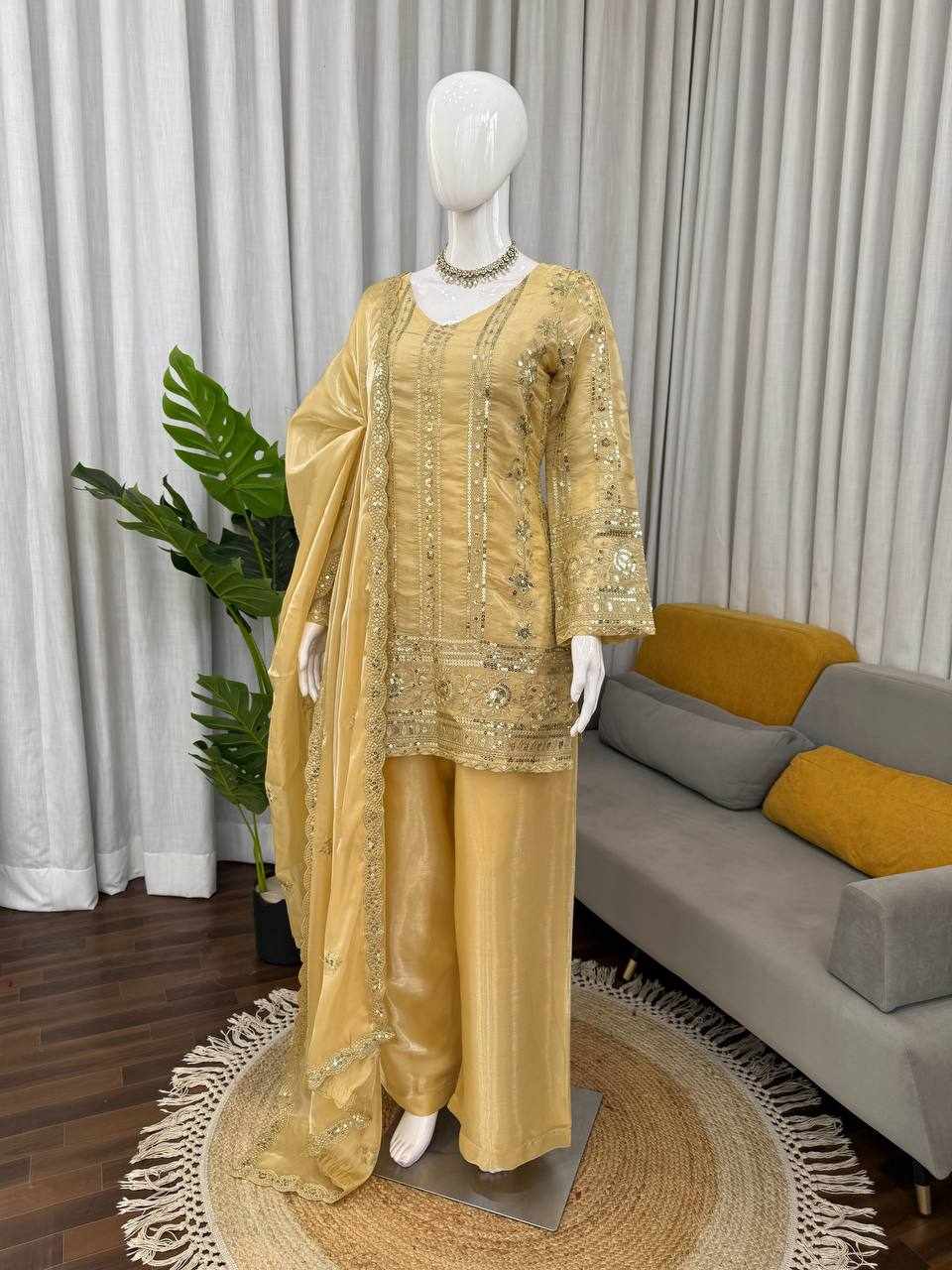 Stylish JMC Silk Plazzo Suit Set featuring elegant thread and sequence embroidery work. Perfect for festive wear, parties, and special occasions, offering a graceful and comfortable look.