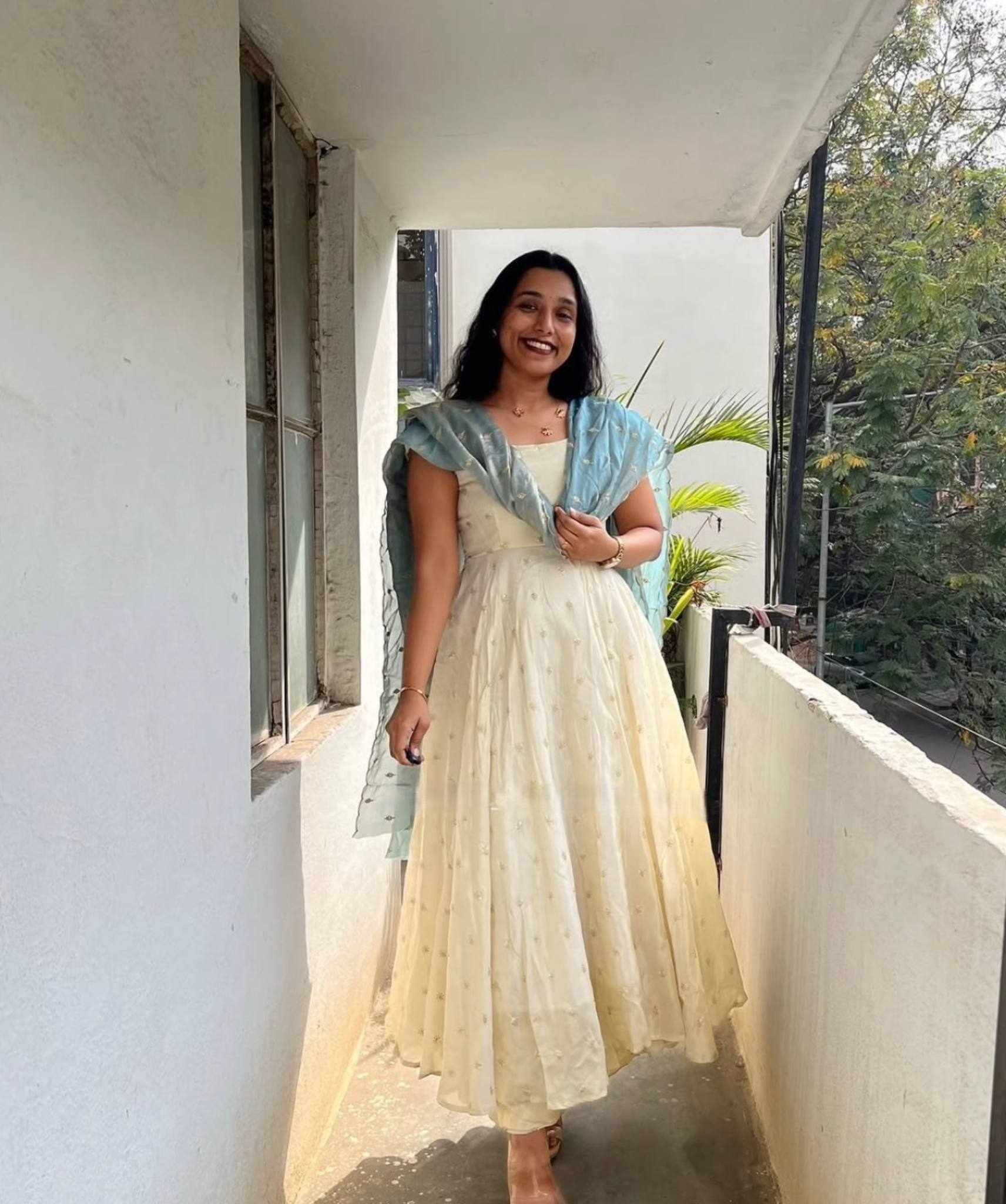 Reviews for PC 567 Casual Wear White Gown With Sky Blue Dupatta