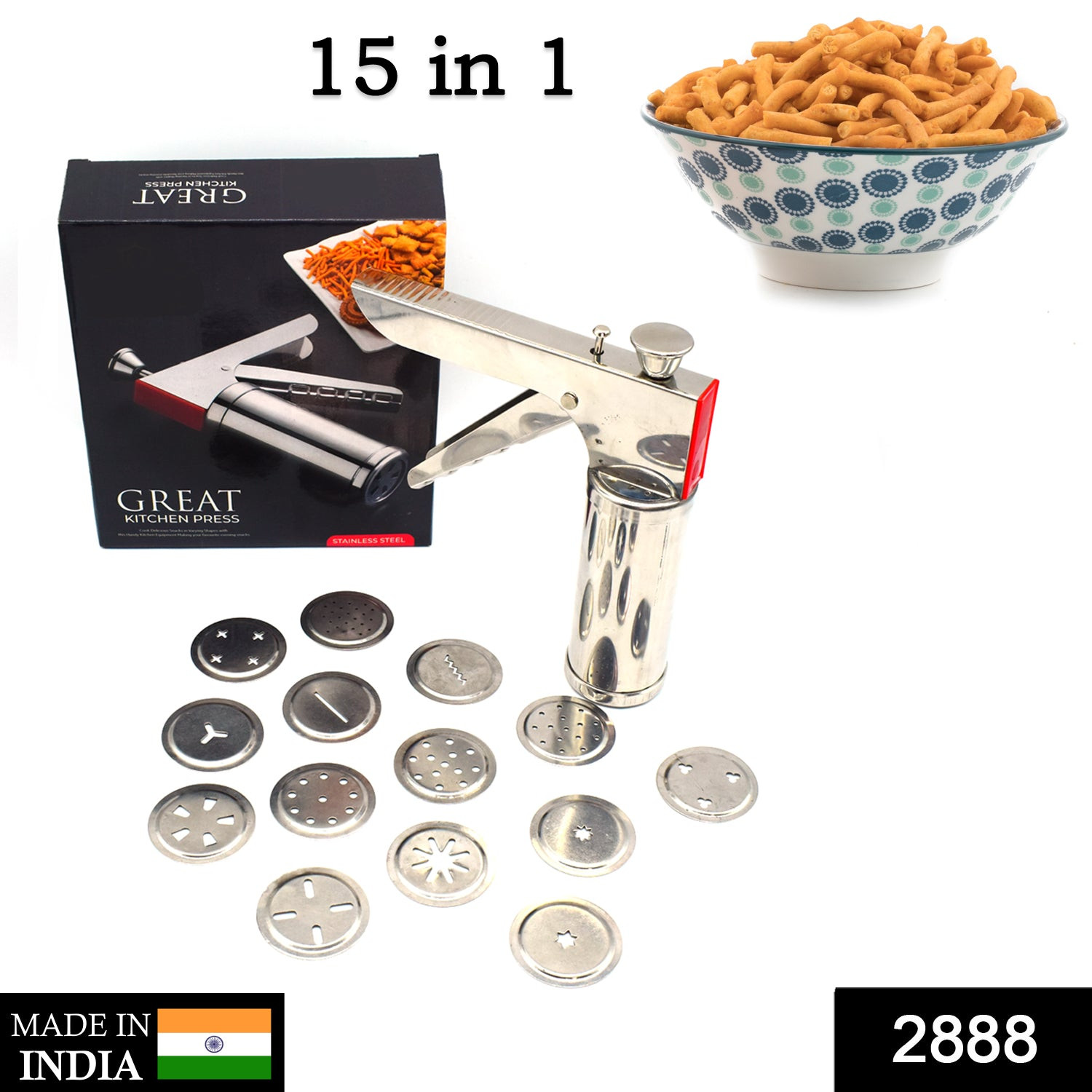 2888 Kitchen Press Sev Maker Machine Chakli Maker Noodles Cookies Namkeen Maker with 15 Different Types of Stainless Steel plates, Silver has been successfully added to your cart .
