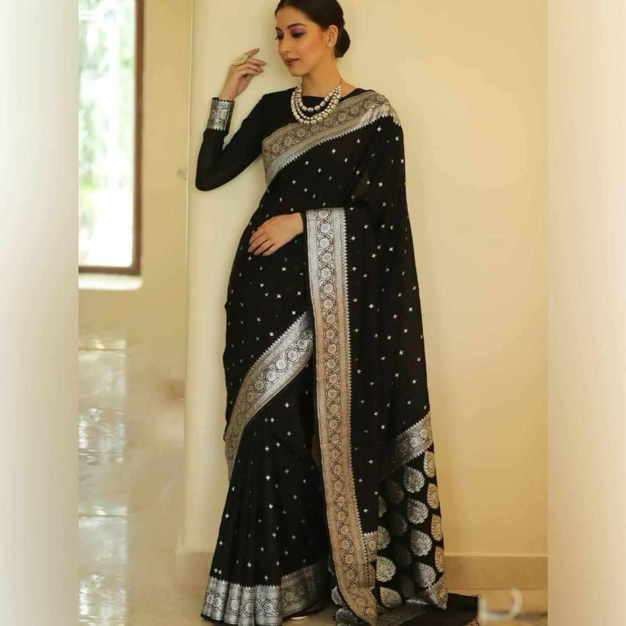 Name : | MF 1680 BLACK BANARASI SOFT LICHI SILK SAREE |