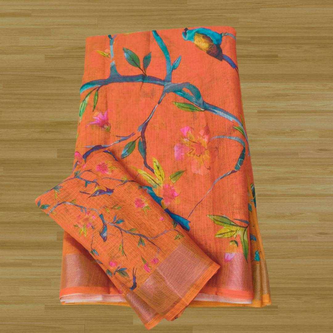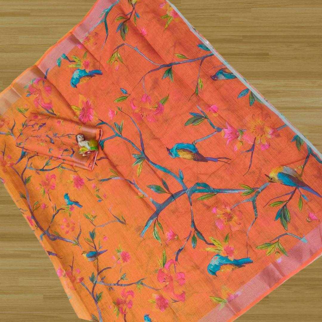 Name : | S4S Linen Orange Bird Digital Print Cotton Saree |