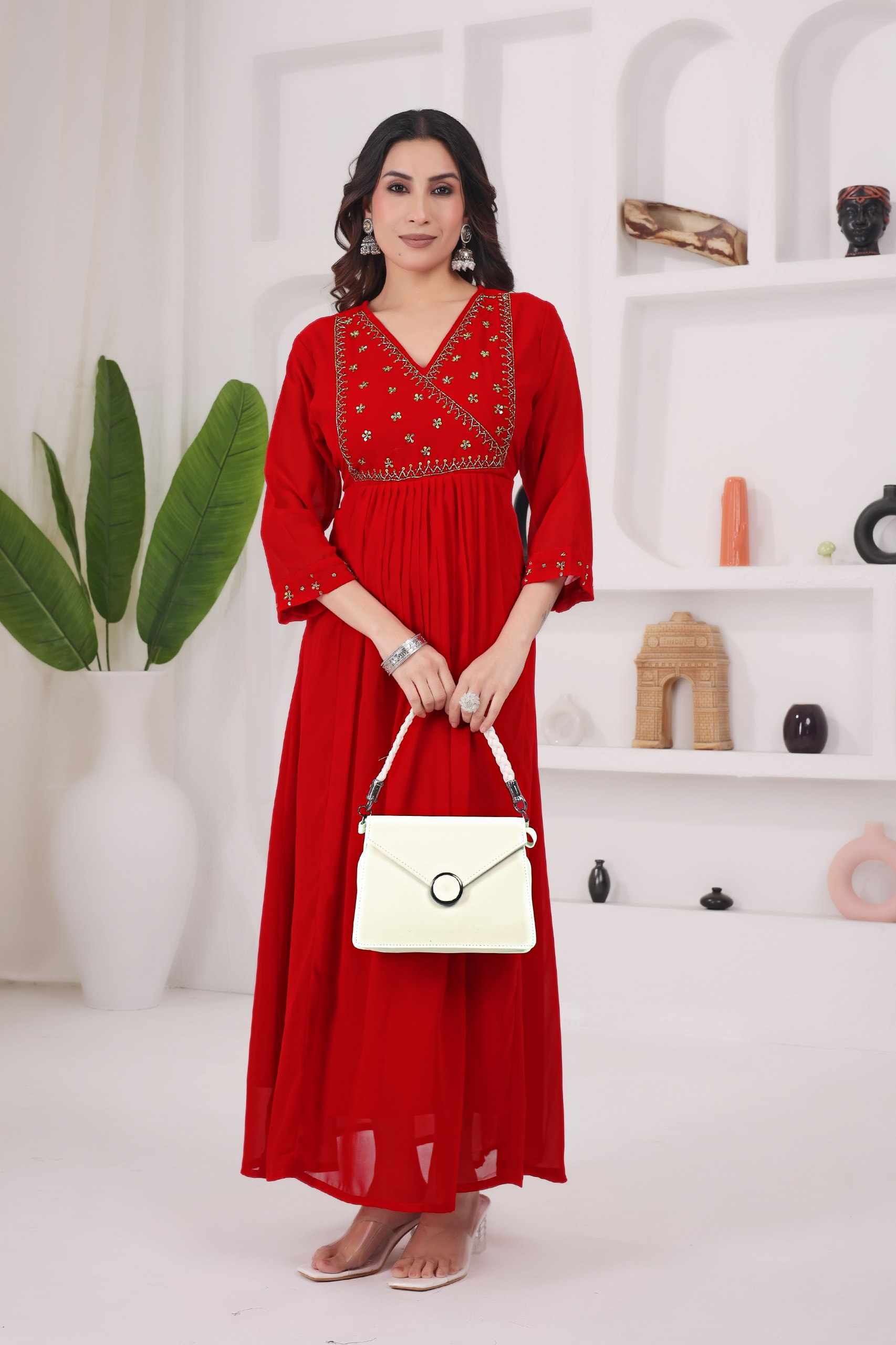 WM12 RED BLOOMING GEORGETTE BEAUTIFUL HANDWORK KURTI